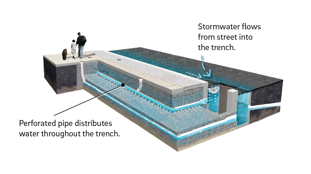 A storage trench is a subsurface rectangular bed cut into the street or sidewalk. The storage areas are designed to infiltrate stormwater or slow its flow into the sewer system.