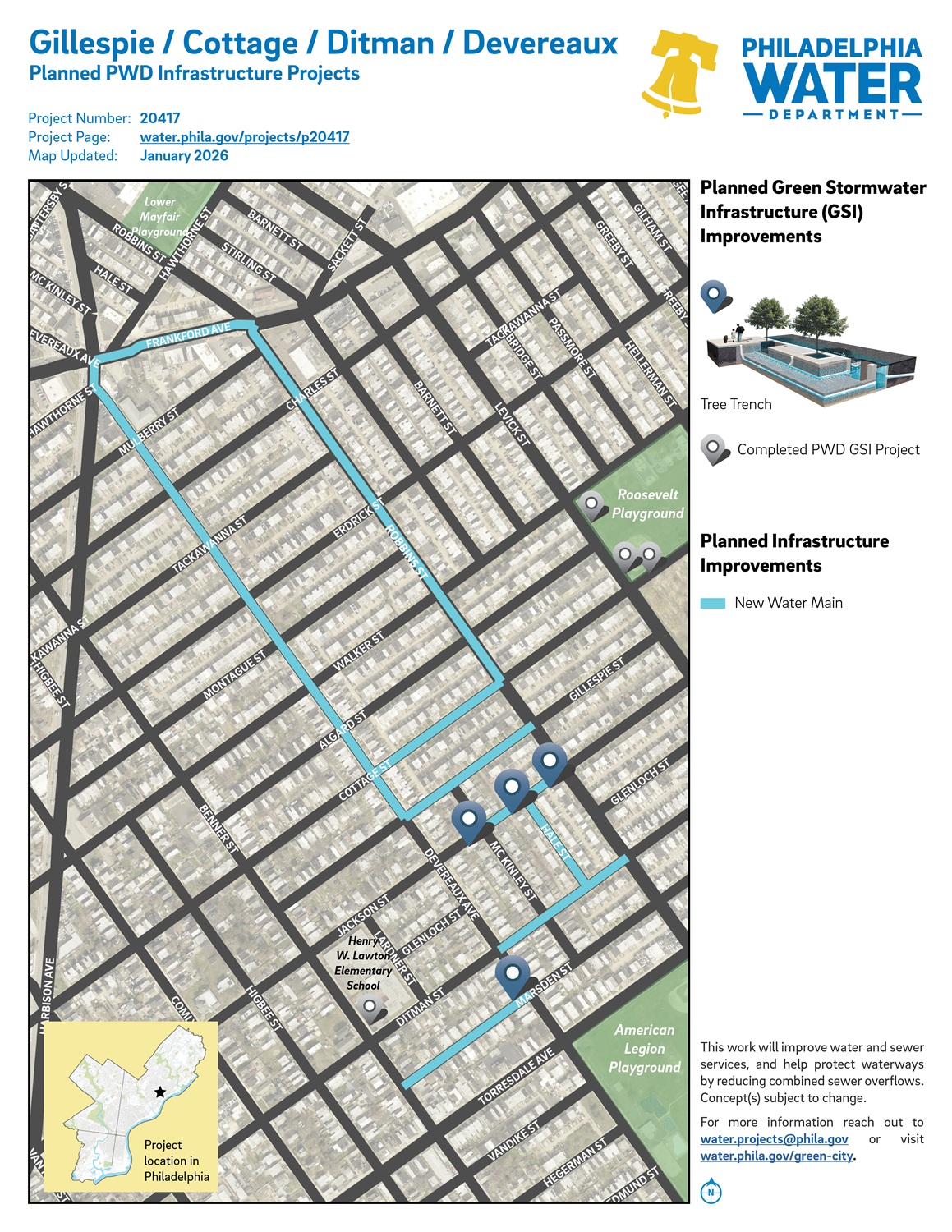 Project #20417 Gillespie / Cottage / Ditman / Devereaux is a planned PWD project in the Tacony neighborhood in Northeast Philadelphia. It will build new water mains and install green stormwater infrastructure (GSI).