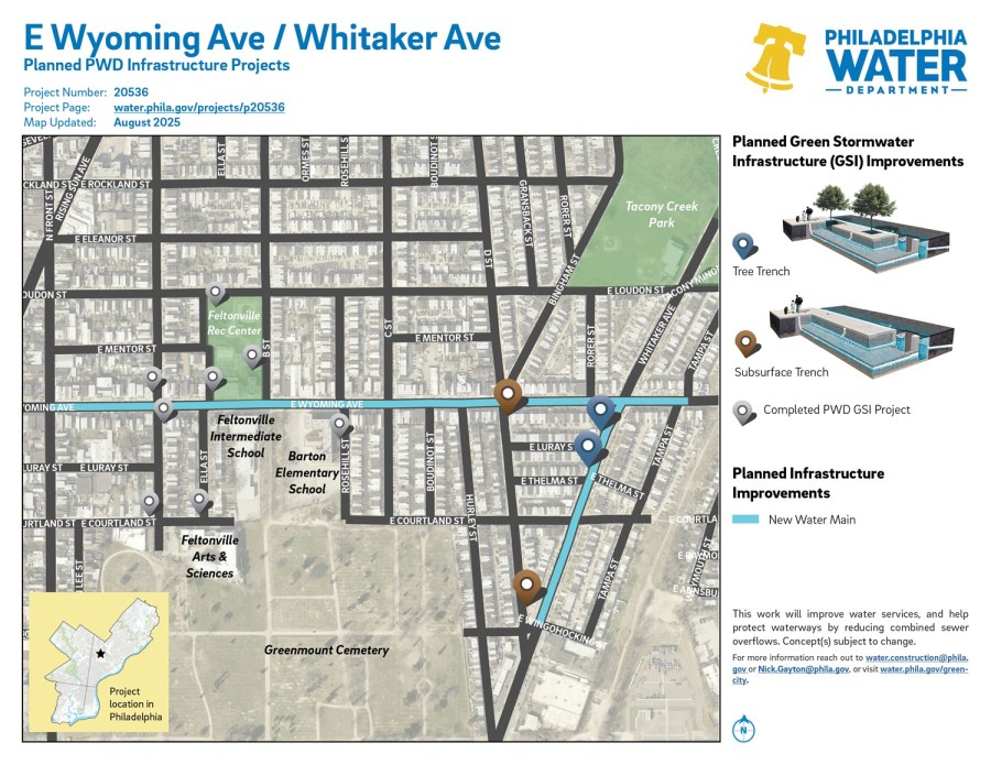 Project #20536 Wyoming / Whitaker will replace water mains and install green stormwater infrastructure in the Feltonville neighborhood.