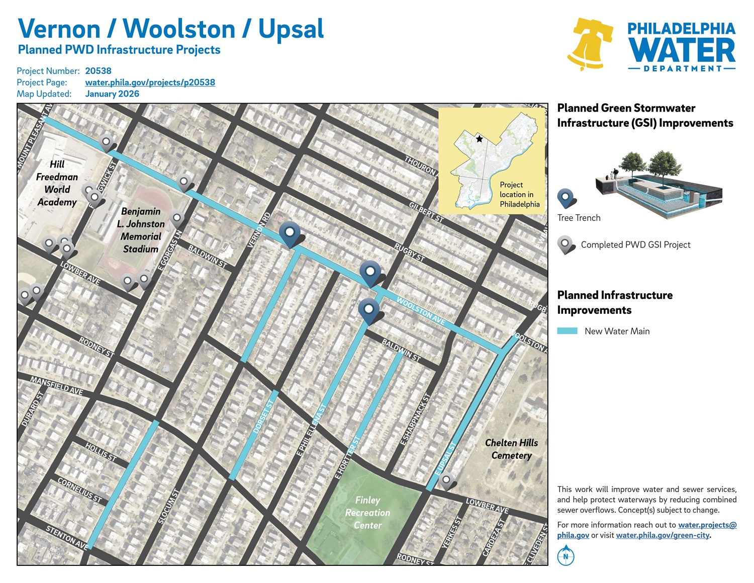 Project #20538 Vernon / Woolston / Upsal is a planned PWD project in the Cedarbrook neighborhood in Northwest Philadelphia. It will build new water mains and install green stormwater infrastructure (GSI).