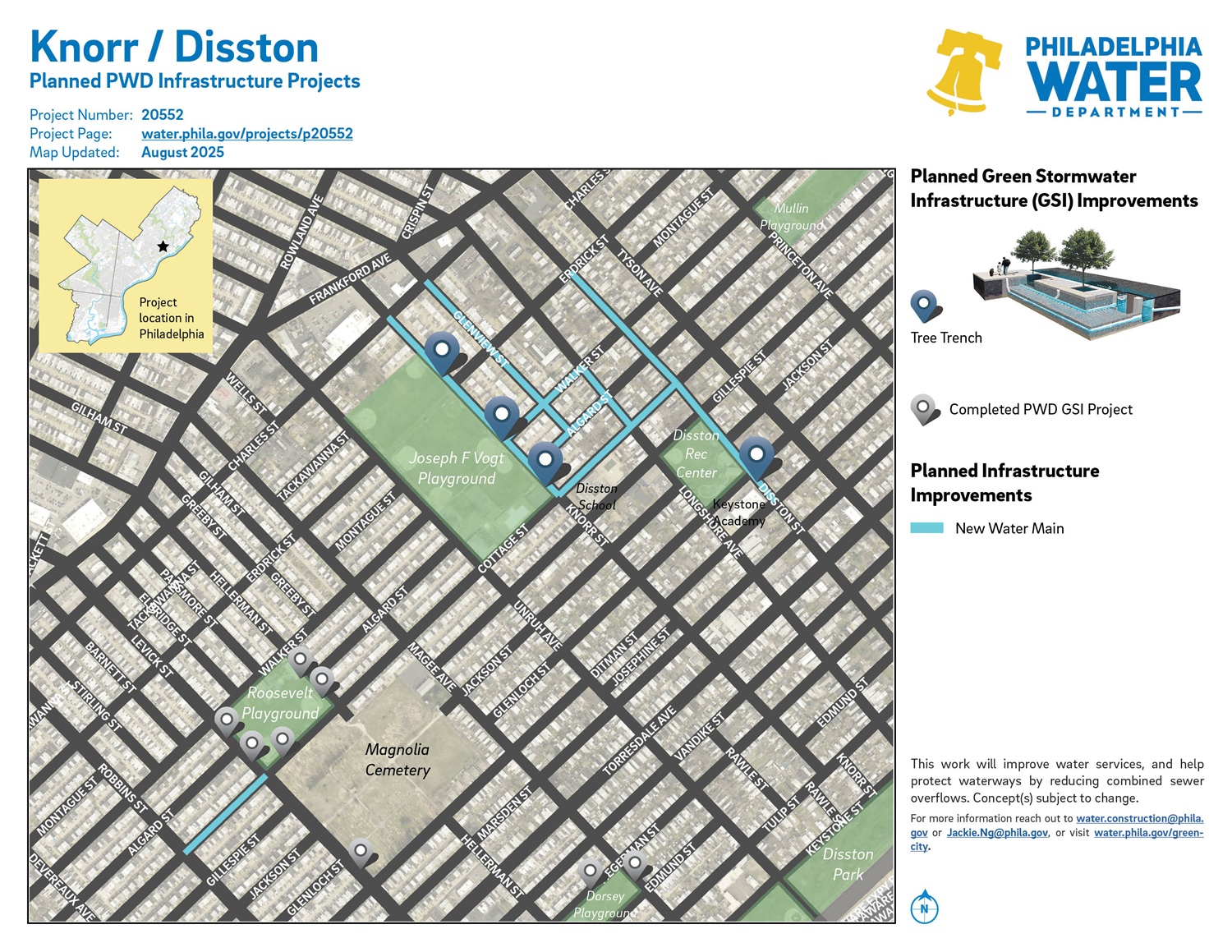 Project #20552 Knorr / Disston will replace water mains and install green stormwater infrastructure. This work will take place along streets in the Tacony neighborhood in Northeast Philadelphia.