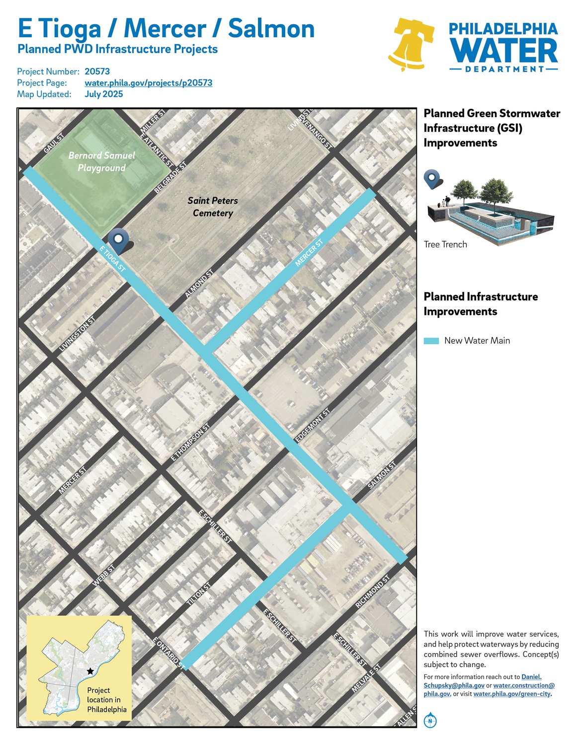 Project #20573 Tioga / Mercer / Salmon is a planned PWD project in the Port Richmond neighborhood. It will build new water mains and green stormwater infrastructure.