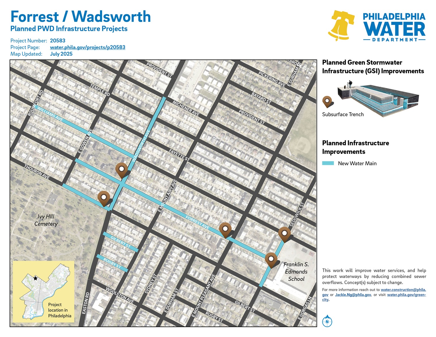 An assigned PWD inspector and engineer will be on-site and can answer questions about the work. Inspector and engineer contact information are listed below.