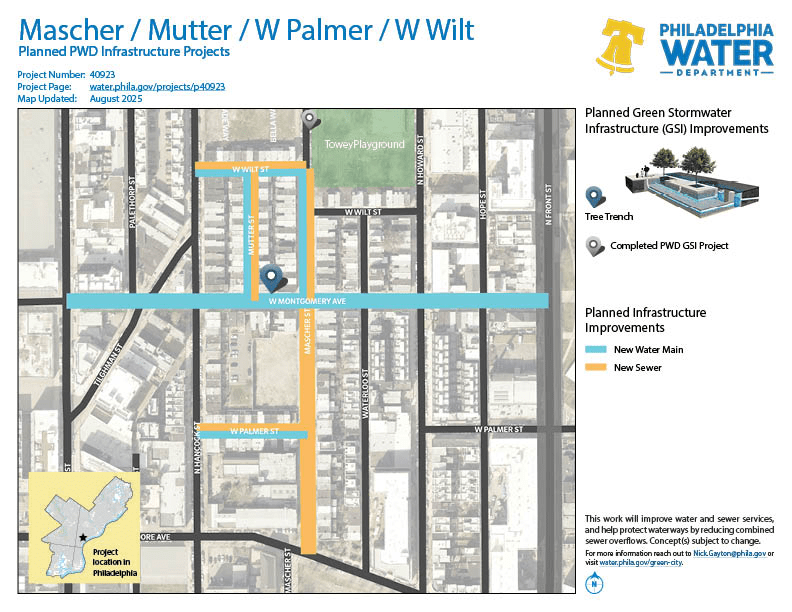 Project #40923 (Manscher/Mutter/W Palmer/W Wilt) will install green stormwater infrastructure (GSI) in the Norris Square neighborhood of North Philadelphia. The project will also include water main and/or sewer upgrades.
