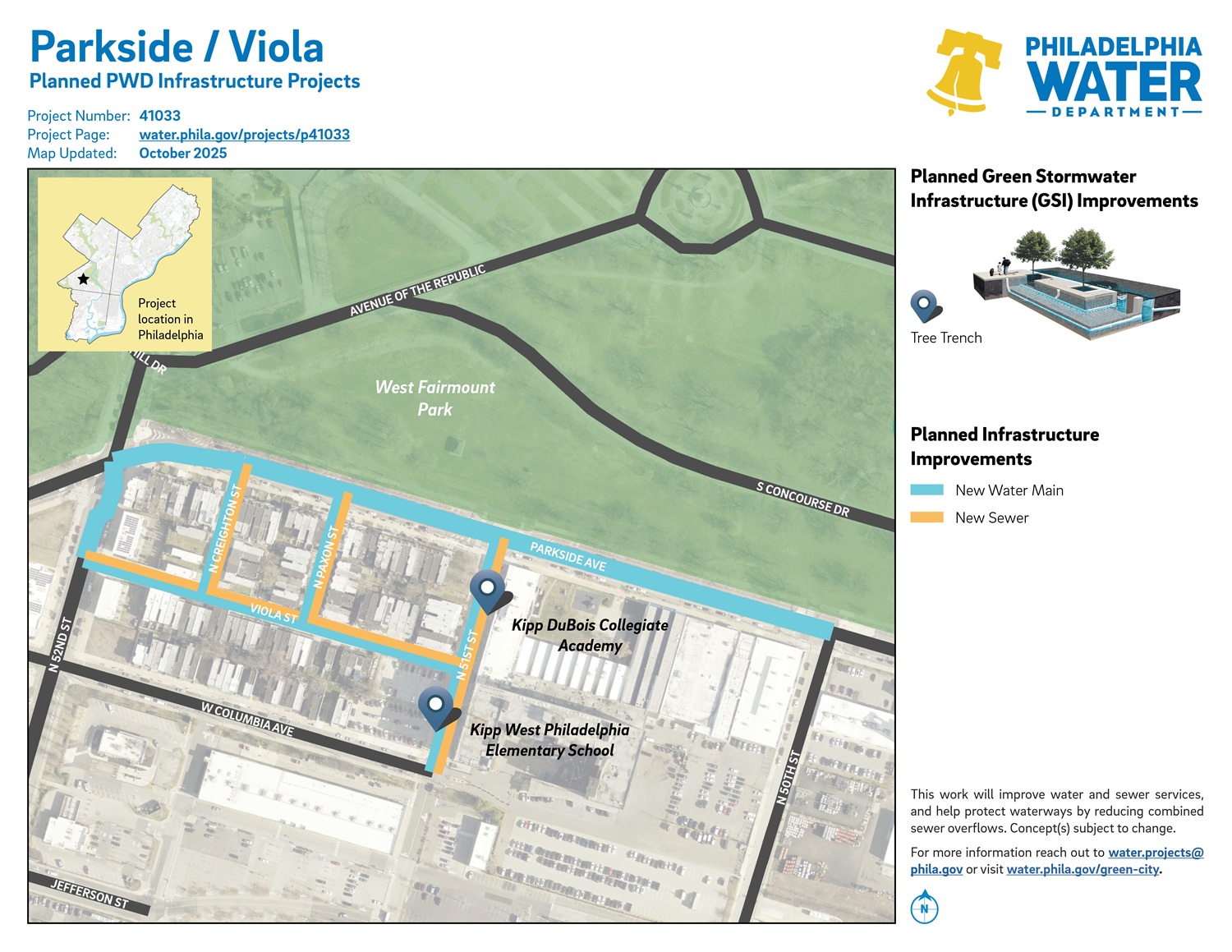 Project #41033 Parkside / Viola is a planned PWD project in the Parkside neighborhood in West Philadelphia. It will build new water mains, new sewers, and green stormwater infrastructure (GSI).