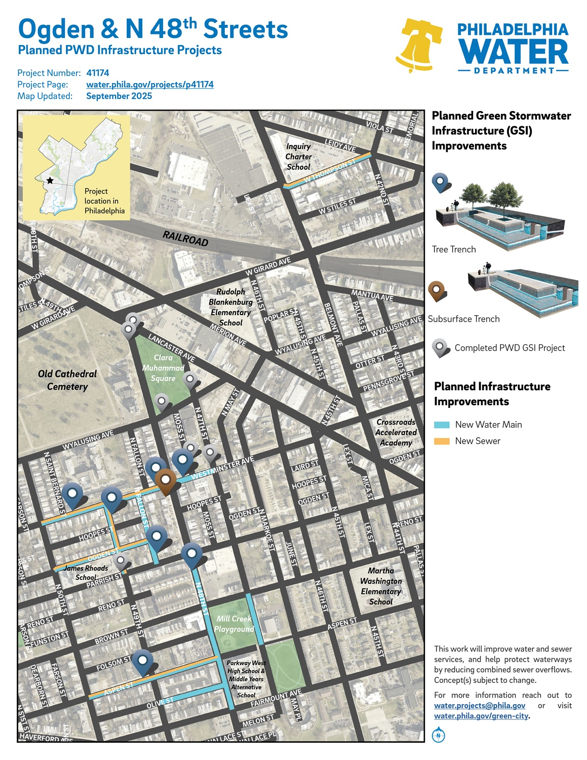 Project #41174 Ogden & N 48th Streets is a planned PWD project in the Mill Creek neighborhood in West Philadelphia. It will build new water mains, new sewers, and green stormwater infrastructure (GSI).