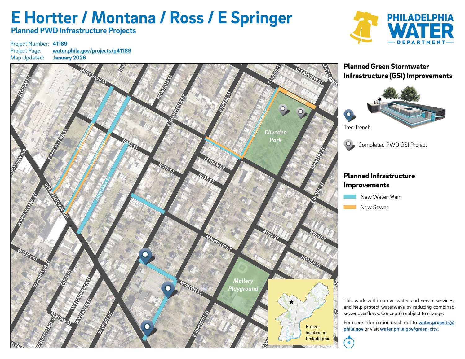 Project #41189 E Hortter / Montana / Ross / E Springer is a planned Philadelphia Water Department project that will replace water mains and sewers and install green stormwater infrastructure (GSI) in the East Mount Airy neighborhood of Northwest Philadelphia.
