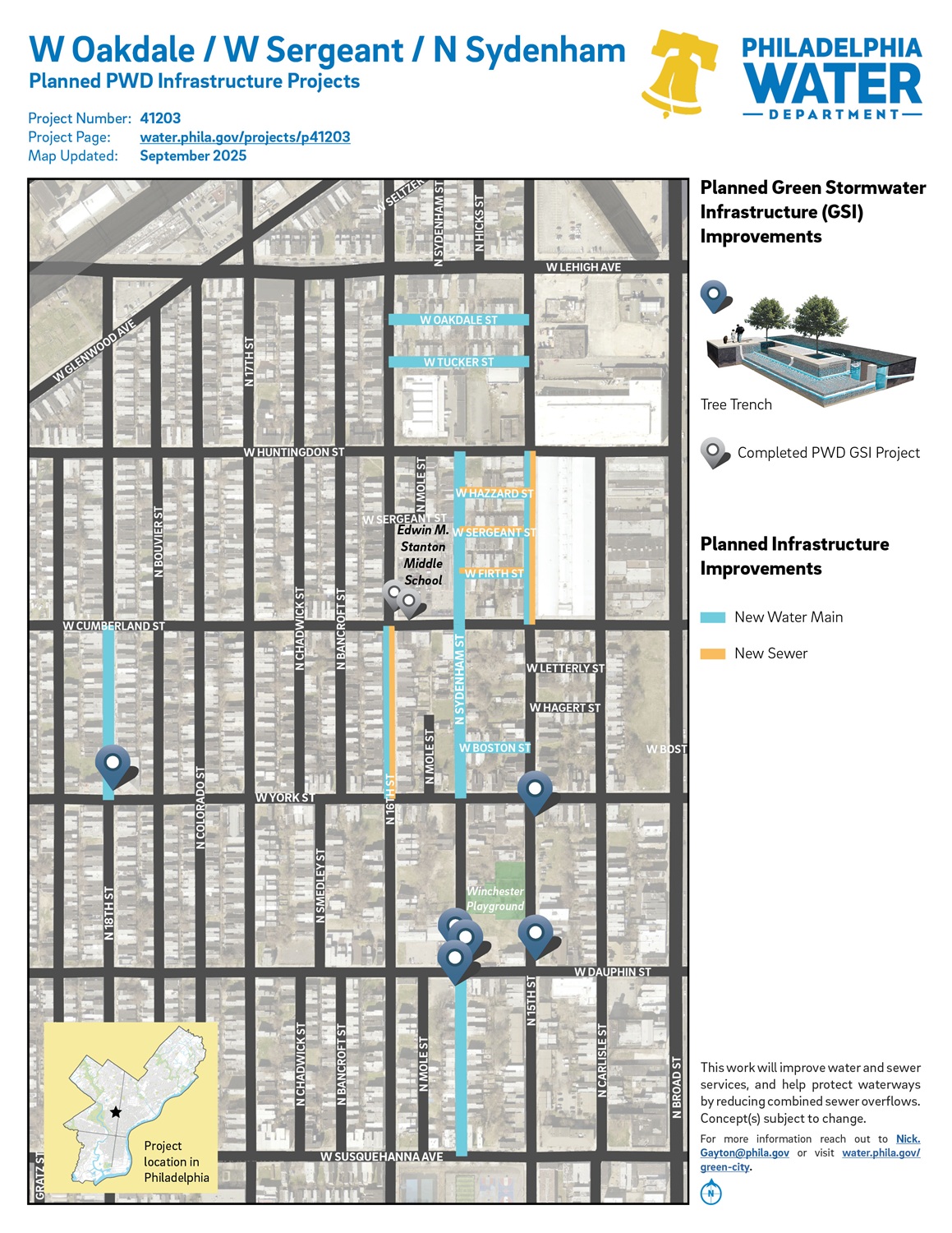 Project #41203 W Oakdale / W Sergeant / N Sydenham is a Water Department capital project that will implement green stormwater management infrastructure tools in the Glenwood neighborhood of North Philadelphia. It will also install new water mains and sewers throughout the neighborhood.