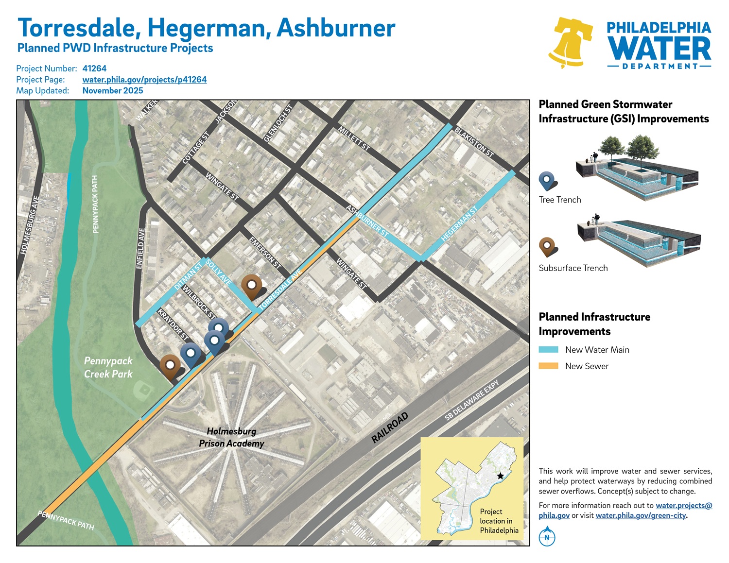 Project #41264 Torresdale, Hegerman, Ashburner is a planned PWD project in the Frankford neighborhood in Northeast Philadelphia. It will build new water mains, new sewers, and green stormwater infrastructure (GSI).
