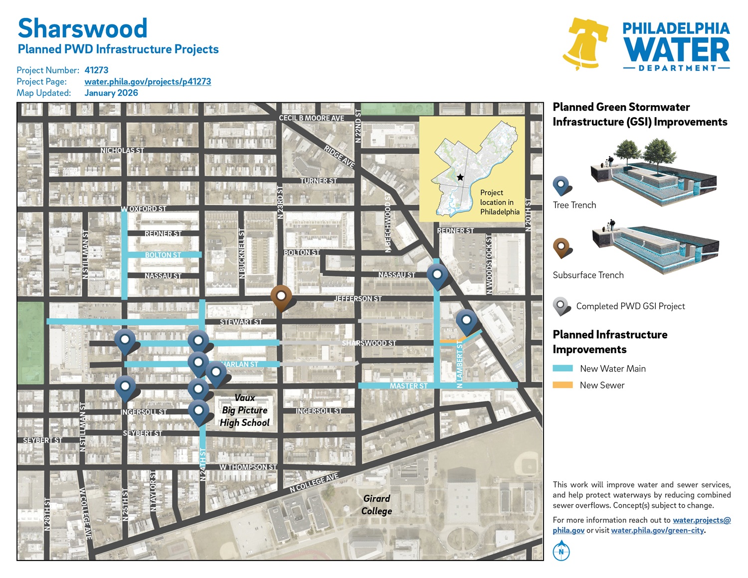 For more information, please email the PWD community outreach team at water.projects@phila.gov. Please specify the project name, project number, and ZIP code in your email.