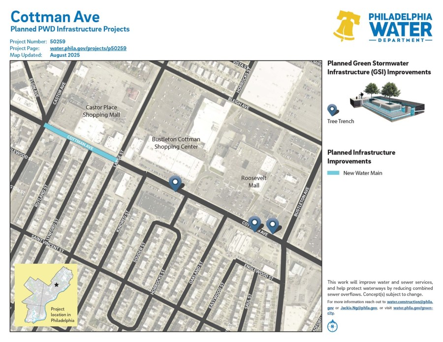 Project #50259 Cottman Ave Streetscape will implement green stormwater management infrastructure tools in the Rhawnhurst/Castor Gardens neighborhoods in Northeast Philadelphia.