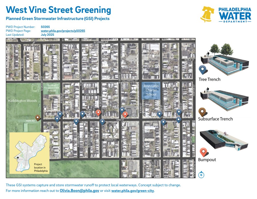 Project #50265 West Vine Street Greening will implement green stormwater management infrastructure tools in the Haddington neighborhood of West Philadelphia.