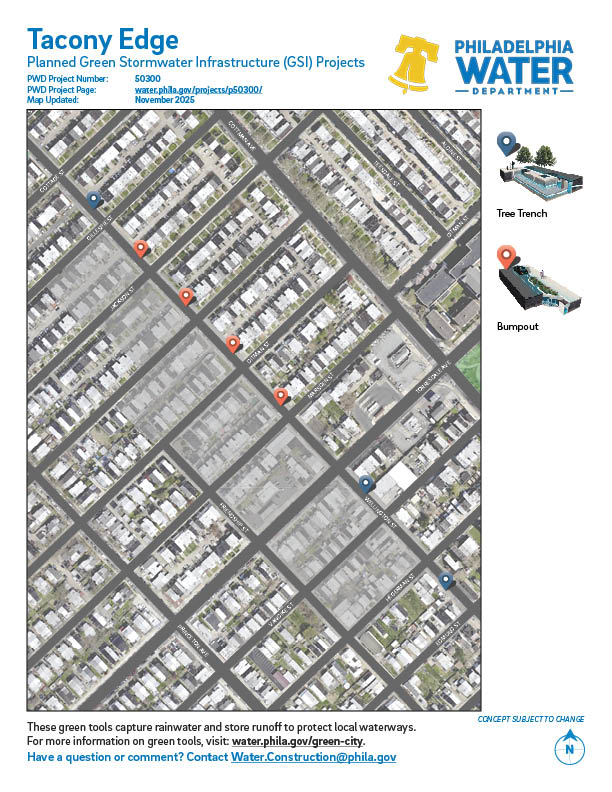 Project #50300 Tacony Edge will implement green stormwater management infrastructure tools in the Tacony neighborhood in Northeast Philadelphia.