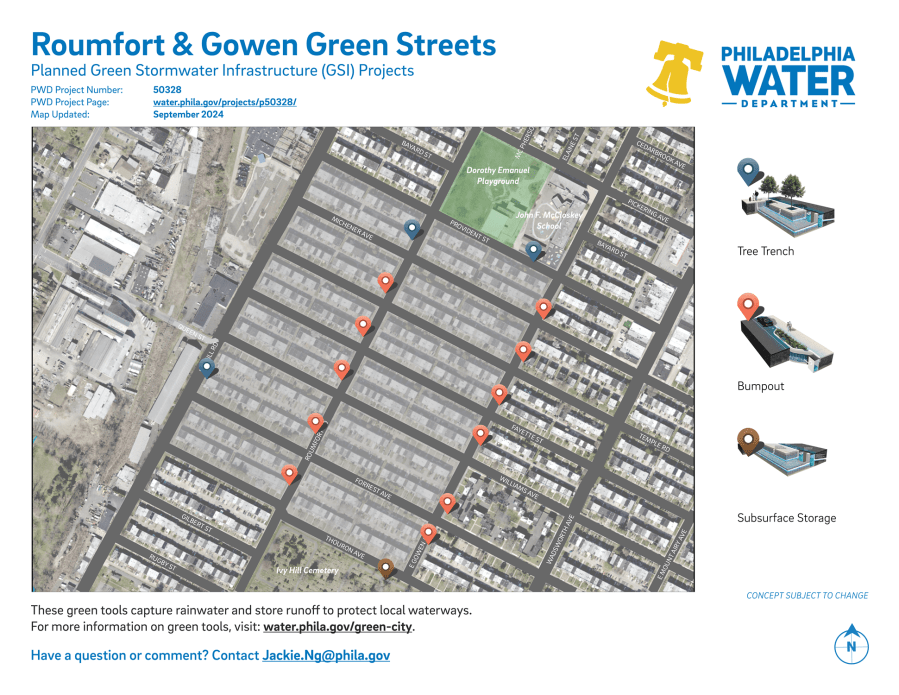 Project #50328 Roumfort & Gowen Green Streets will implement green stormwater management infrastructure tools in the Cedarbrook neighborhood in Northwest Philadelphia.