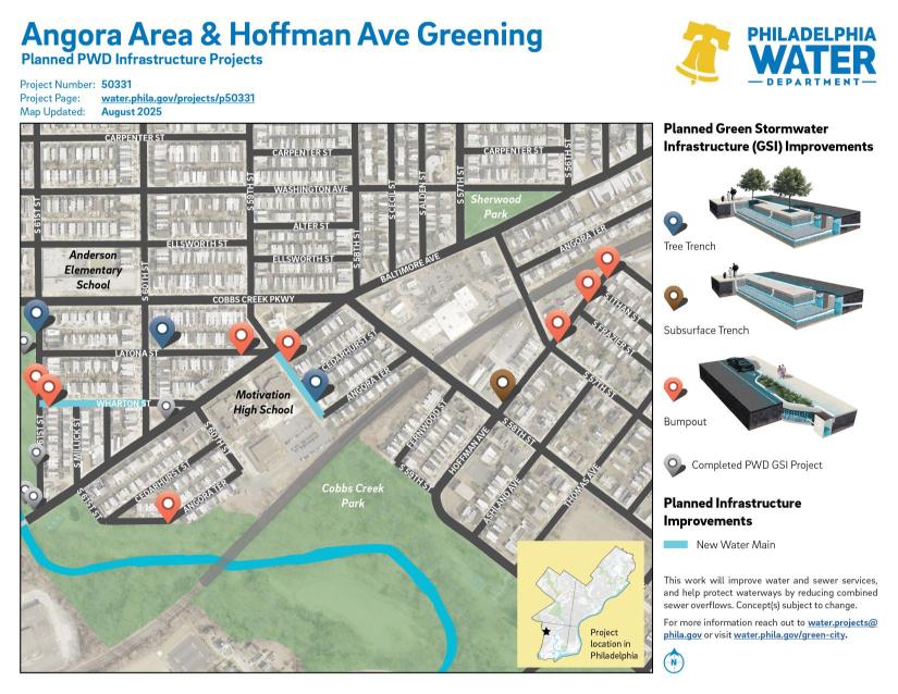Project #50331 Angora Area and Hoffman Ave Greening will implement green infrastructure to improve the stormwater management in the Cobbs Creek neighborhood of West Philadelphia.