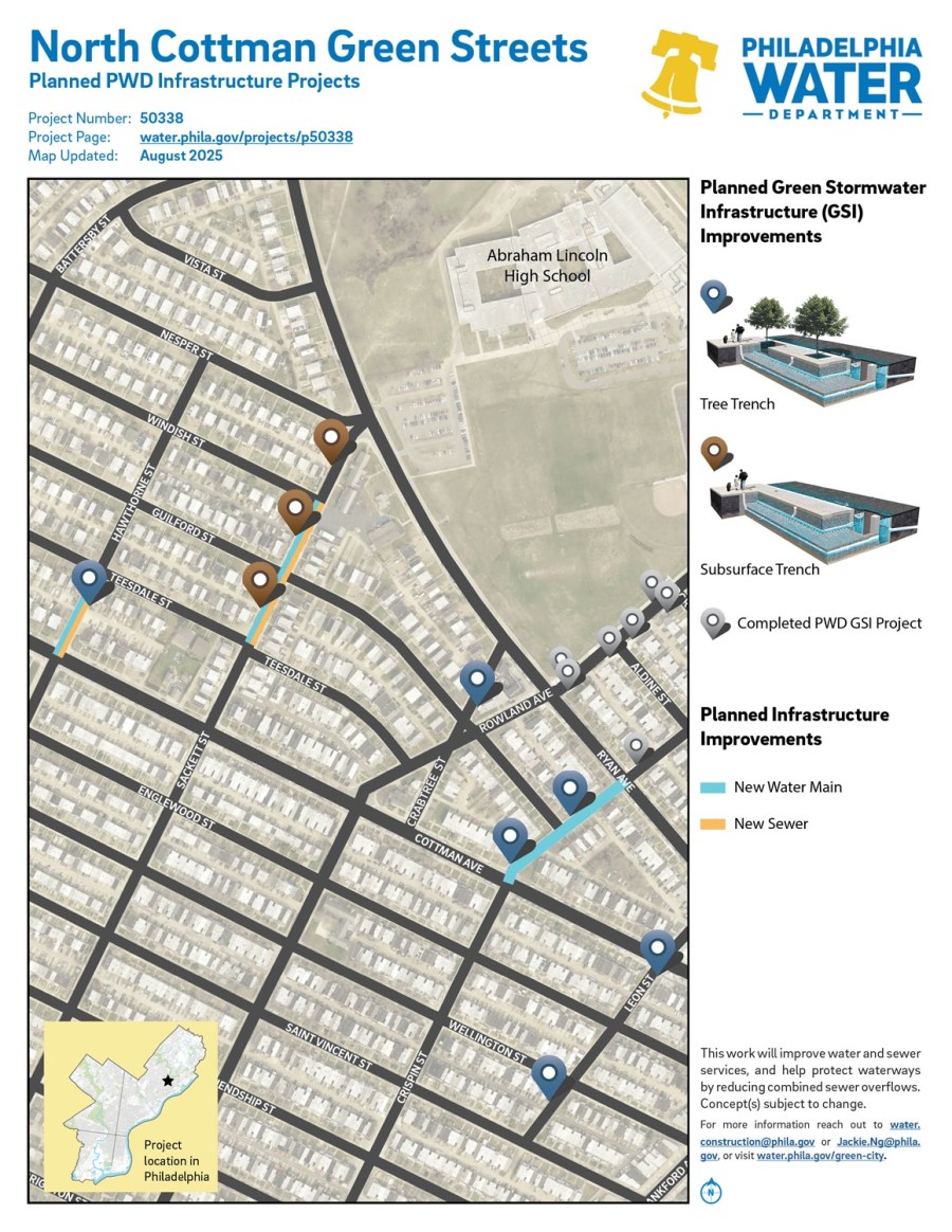 Project #50338 North Cottman Green Streets will implement green stormwater management infrastructure tools in the Mayfair neighborhood in Northeast Philadelphia. It will also install new water mains throughout the neighborhood.
