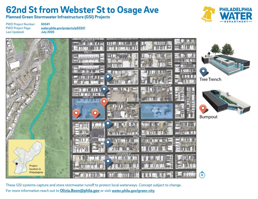 Project #50341 62nd St from Webster St to Osage Ave will implement green infrastructure to improve the stormwater management in the Cobbs Creek neighborhood of West Philadelphia.