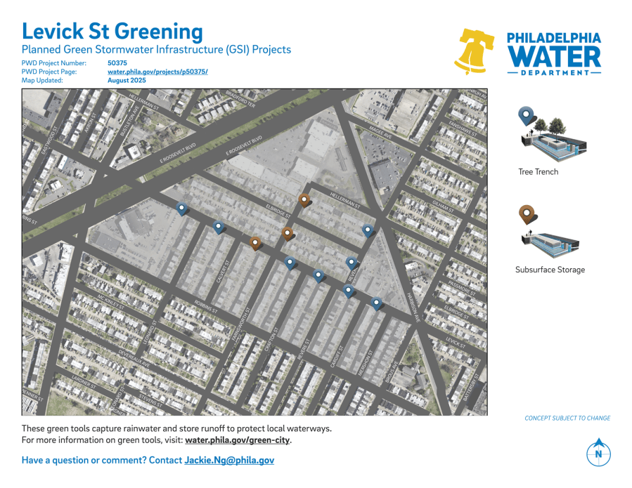 Project #50375 Levick St Greening will implement green stormwater management infrastructure tools in the Mayfair neighborhood in Northeast Philadelphia.