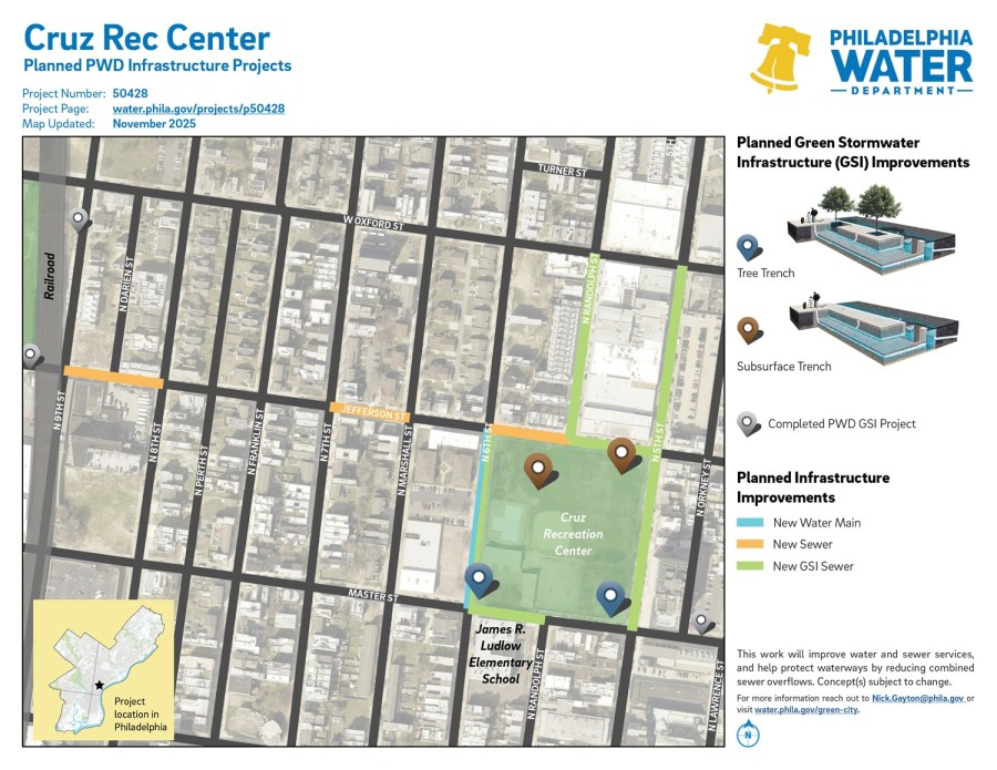 Project #50428 Cruz Rec Center will implement green stormwater infrastructure (GSI) systems within Cruz Recreation Center. This work will improve the stormwater management in the Ludlow neighborhood of North Philadelphia.