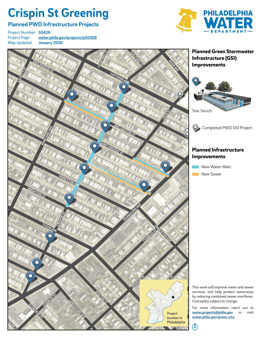 Project #50429 Crispin Street Greening will implement green stormwater management infrastructure tools in the Mayfair neighborhood in Northeast Philadelphia.