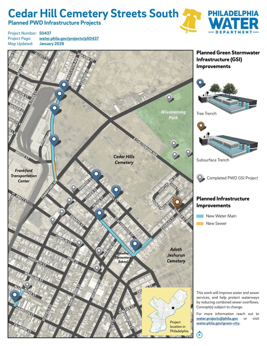 Project #50437 Cedar Hill Cemetery South Streetsis a planned PWD project in the Frankford neighborhood. It will build new water mains, new sewersand green stormwater infrastructure (GSI).