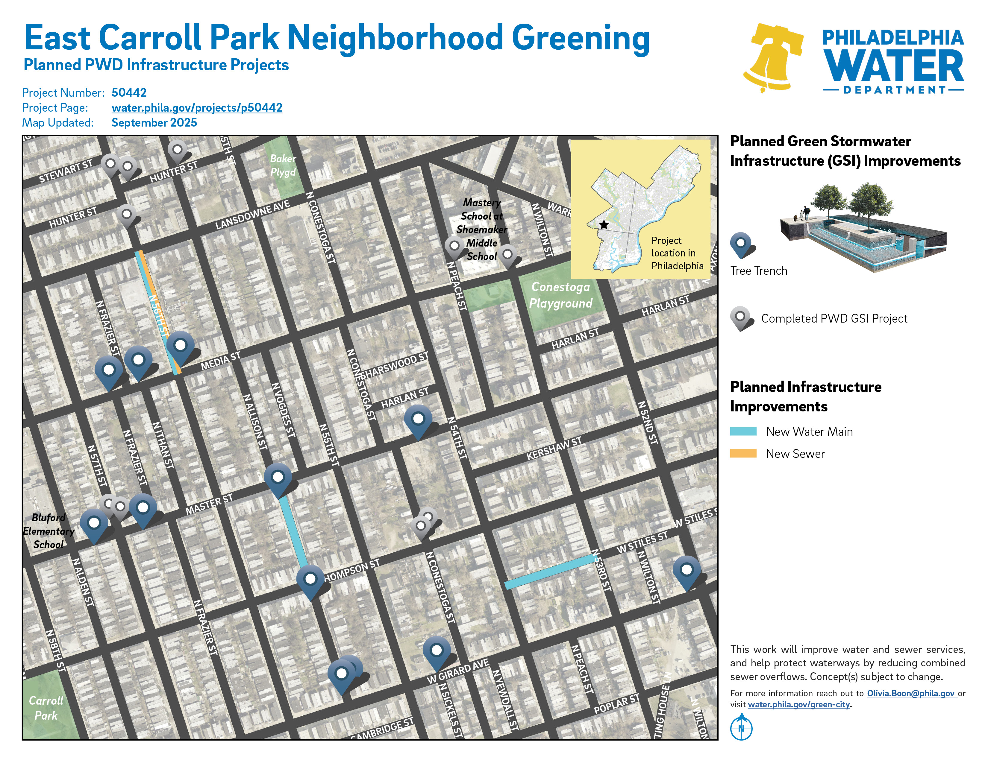 Project #50442 East Carroll Park Neighborhood Greening is a planned PWD project in the Carroll Park neighborhood. It will build green stormwater infrastructure, and install new water mains and sewers in the neighborhood.