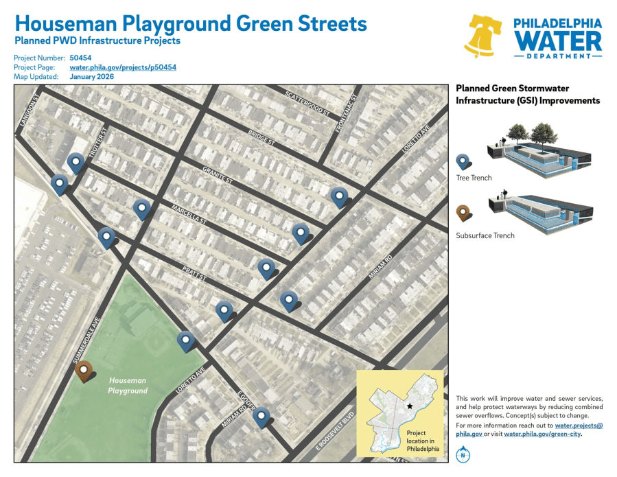 Project #50454 Houseman Playground Green Streets is a planned PWD project in the Summerdale neighborhood in Northeast Philadelphia. It will build green stormwater infrastructure (GSI).