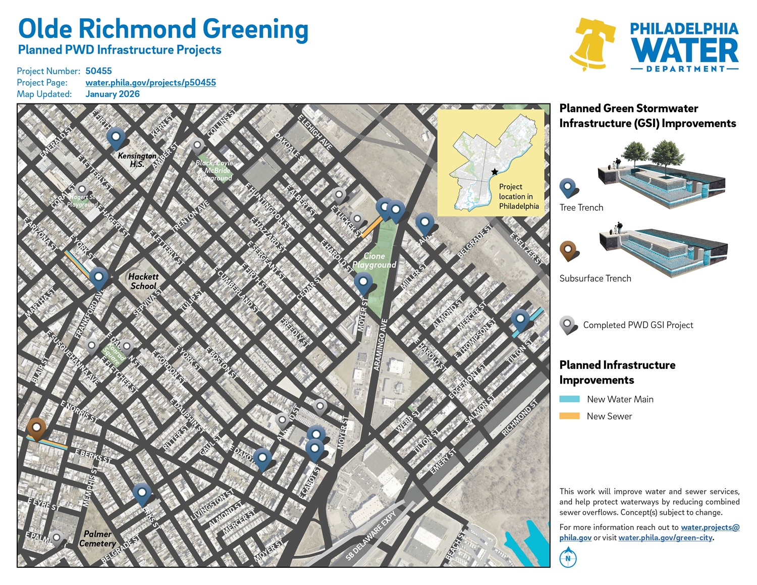 Project #50455 Olde Richmond Greening is a planned Philadelphia Water Department project that will replace water mains and sewers and install green stormwater infrastructure in an area that borders the neighborhoods of East Kensington, Fishtown, and Port Richmond in the River Wards section of Philadelphia.