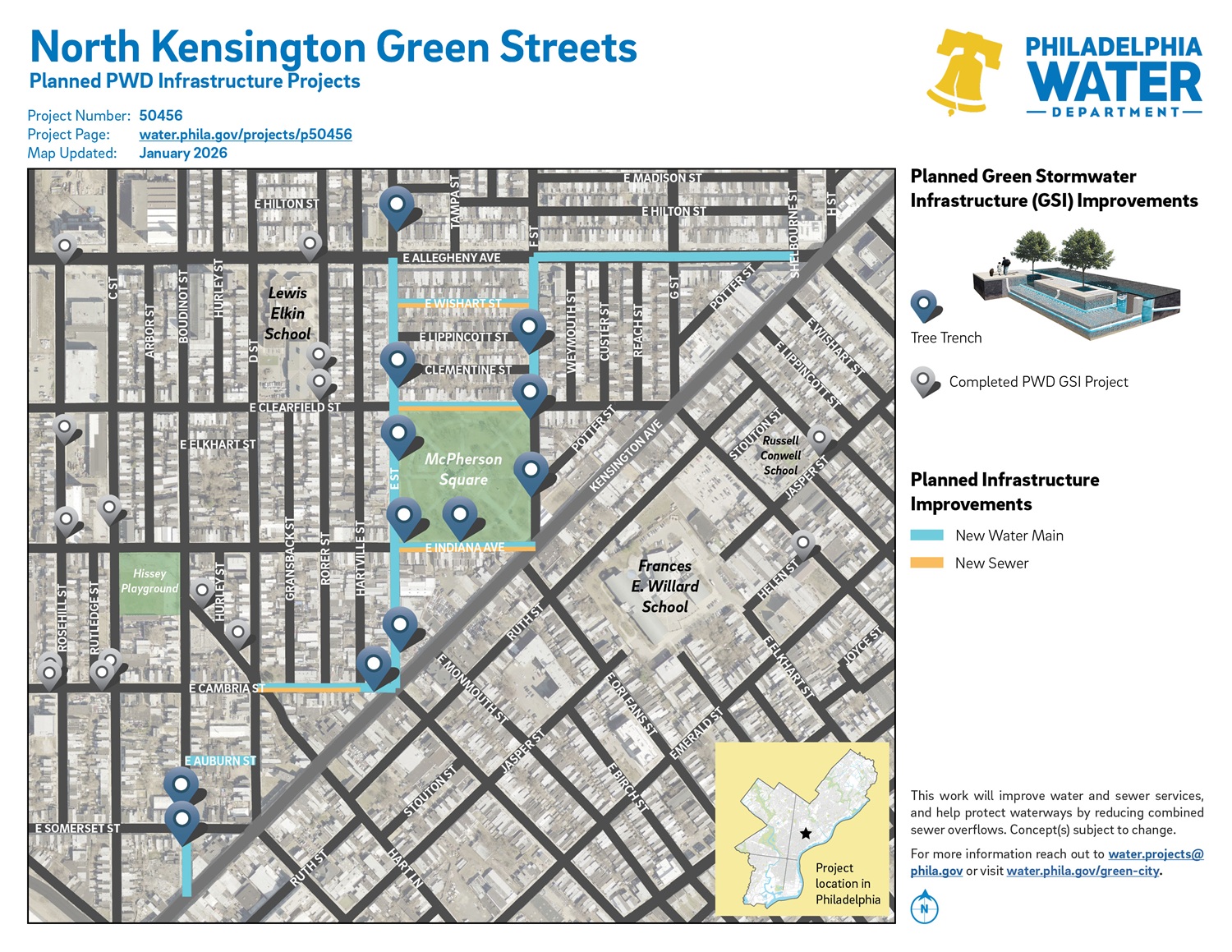 Project #50456 North Kensington Green Streets is a planned PWD project in the Kensington neighborhood in North Philadelphia. It will build new water mains, new sewers, and green stormwater infrastructure (GSI).