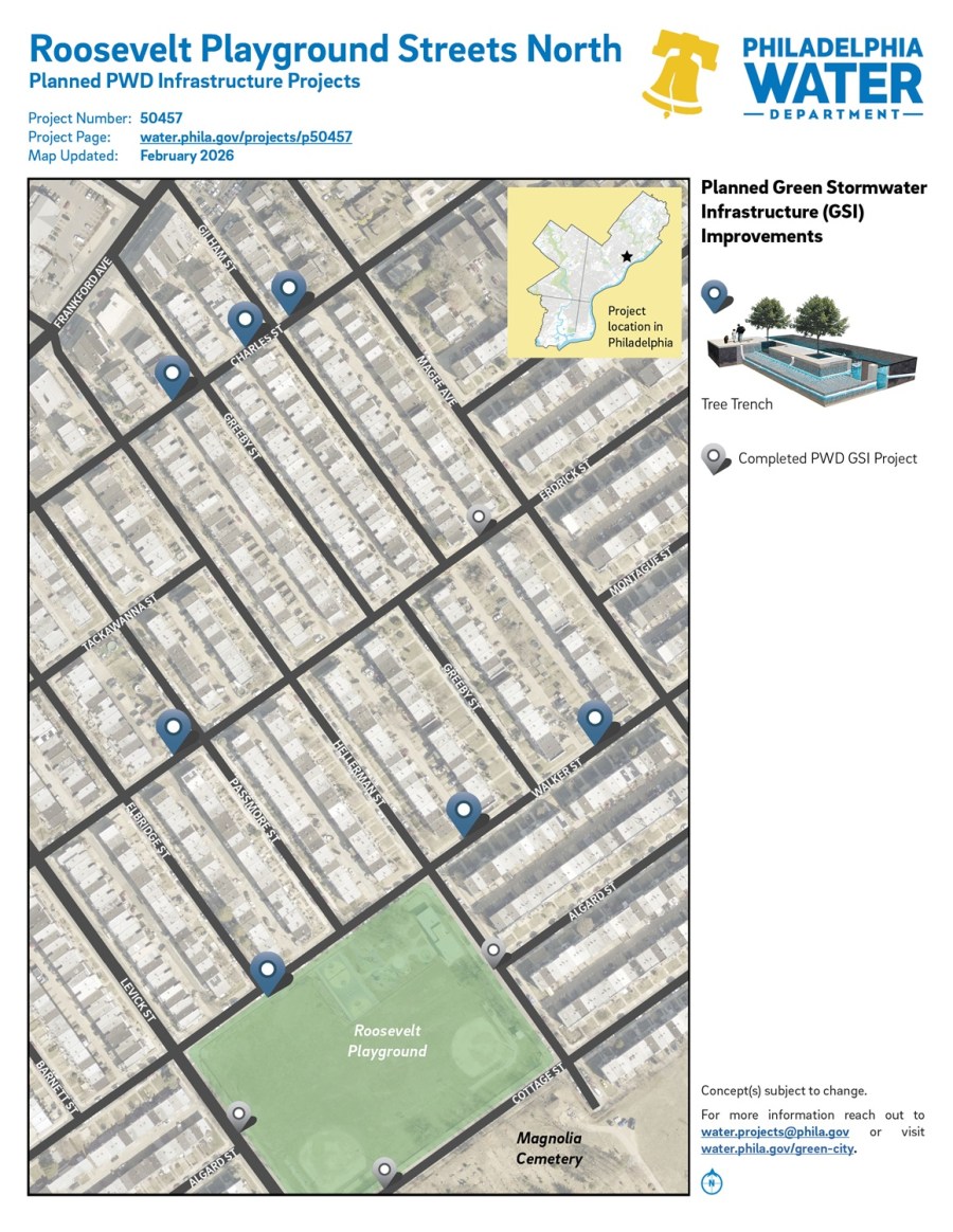 Project #50457 Roosevelt Playground Streets North is a planned PWD project in the Tacony neighborhood in Northeast Philadelphia. It will install green stormwater infrastructure (GSI).