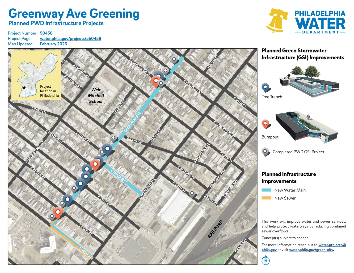 For more information, please email the PWD community outreach team at water.projects@phila.gov. Please specify the project name, project number, and ZIP code in your email.